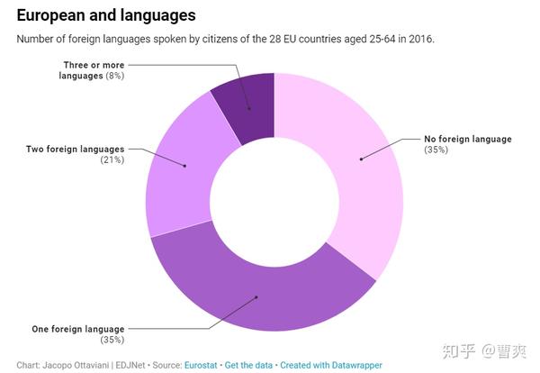 很多人有一个误区,认为大多数欧洲人会说好多种语言,但从欧盟统计局的官方数字来看,可能会令很多人失望:根据2017年的统计,欧洲7.4亿人口中,能够说1门外语的大约有35%,能够说2门外语的大约有21%,能够说3种或者更多外语的大约有8%;剩下的35%承认自己不会外语——根据定义,能够说2种以上外语的,可以定义为“多语言能力者”,这也不过30%而已。