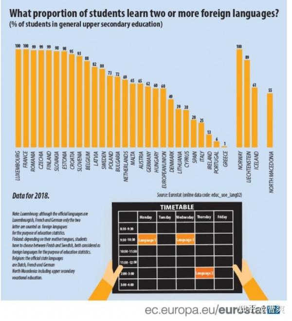 说到这里,不得不说,我们国内孩子也在进步,但是距离欧洲的外语教育水平,还是有相当的差距,中国具有2门以上外语能力的学生和成人,比例都还太低太低。